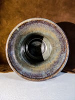 A rustic flower vase with seven trimmed steps across the side walls. The bottom foot is finished with a spiral chattering design that encompasses the bare bottom maker's mark.